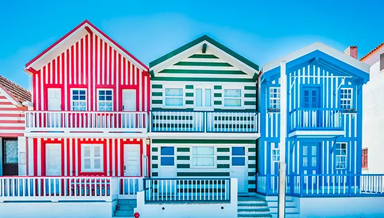 On the western side of Aveiro, we find the Costa Nova beach. This locale is adorned by the traditional fishermen's houses painted with vertical or horizontal stripes of different colors, creating a supremely unique view from any other beach in the country.